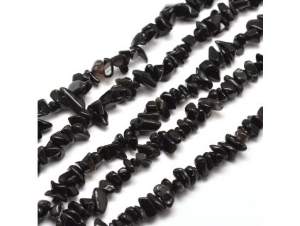 Obsidián zlomky 5~8x5~8mm šňůra cca 80cm. Průvlak cca 1mm. Cena uvedena za 1 šňůru