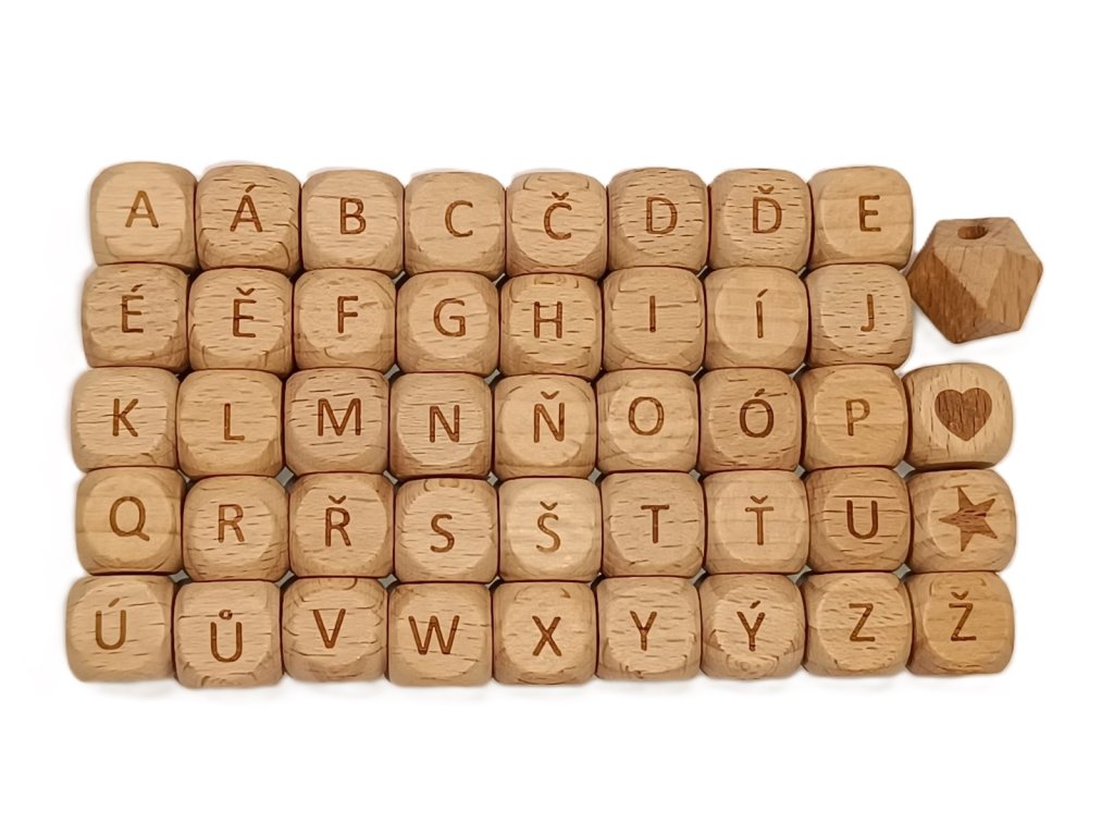 Dřevěný korálek z bukového dřeva ve tvaru kostky s vygravírovaným písmenem
