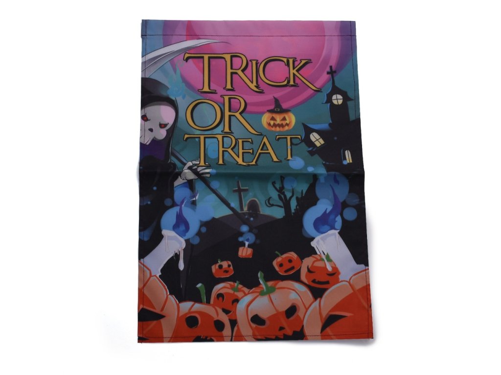 Halloween vlajka banner 460x320mm lebka. Rozměr 460x320x0.4mm, otvor na navlečení 18mm. Cena uvedena za 1 kus