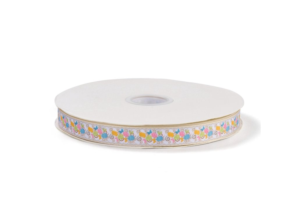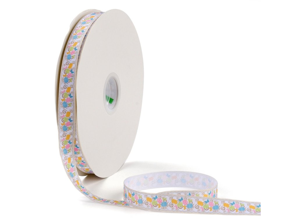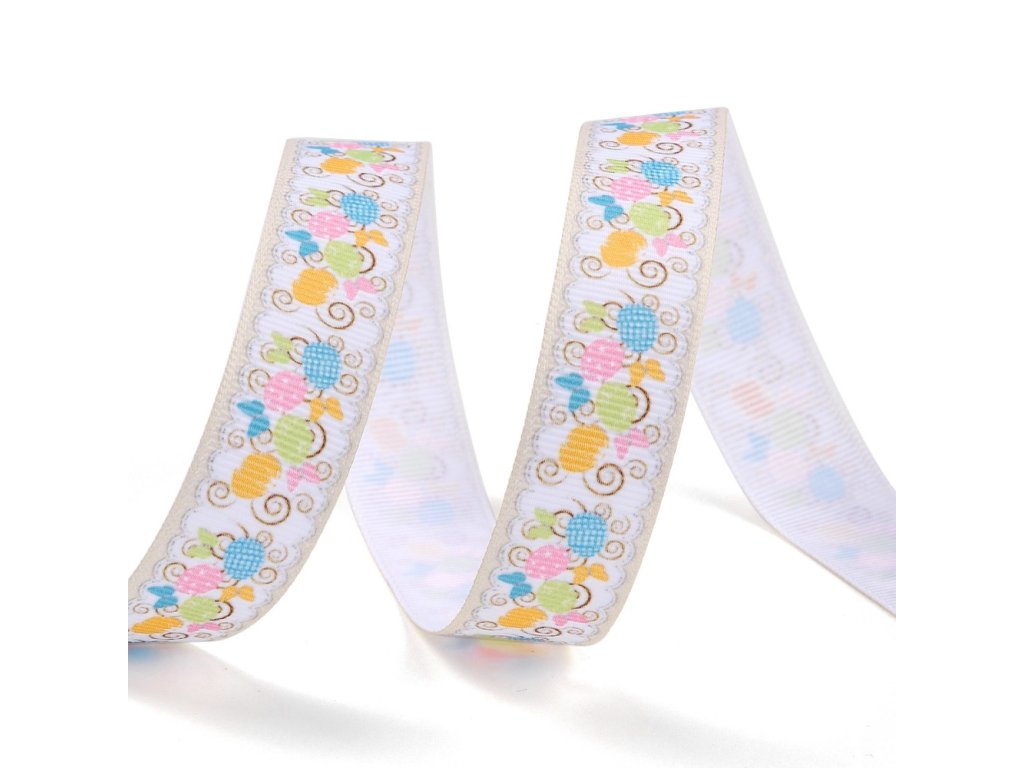 Grogrénová stuha s velikonočním motivem s jemným žebrováním. Stuha je široká 18 mm a prodává se po 3 m