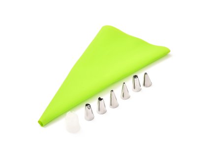 Plastový zdobící sáček se 6 nerezovými nástavci. Rozměr sáčku 303x175x0.5mm. Cena uvedena za 1 sadu